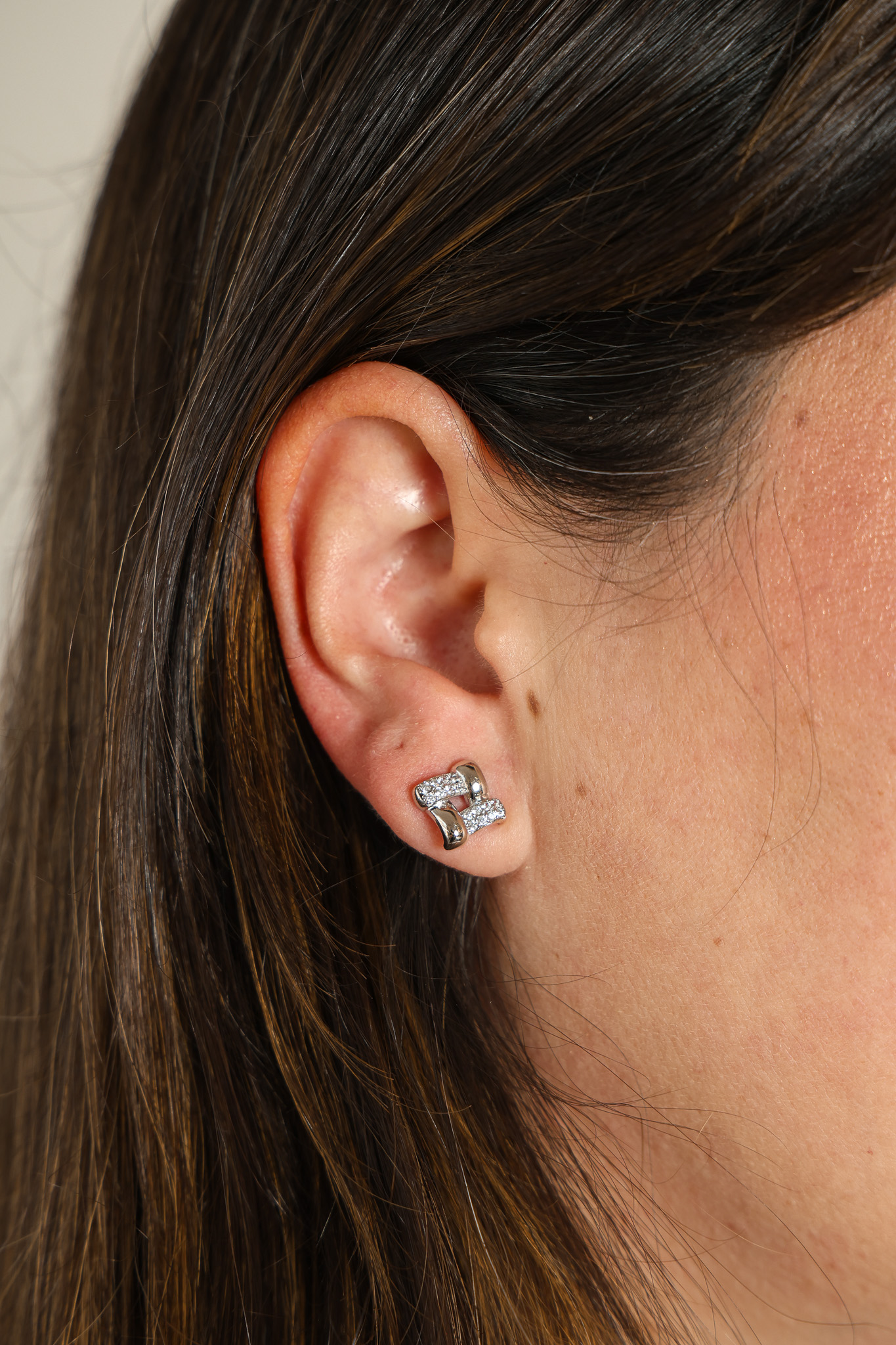 Seu design geométrico com toque orgânico combina o brilho delicado das pedras com o acabamento polido do metal, criando um equilíbrio sofisticado que ilumina o rosto com naturalidade.